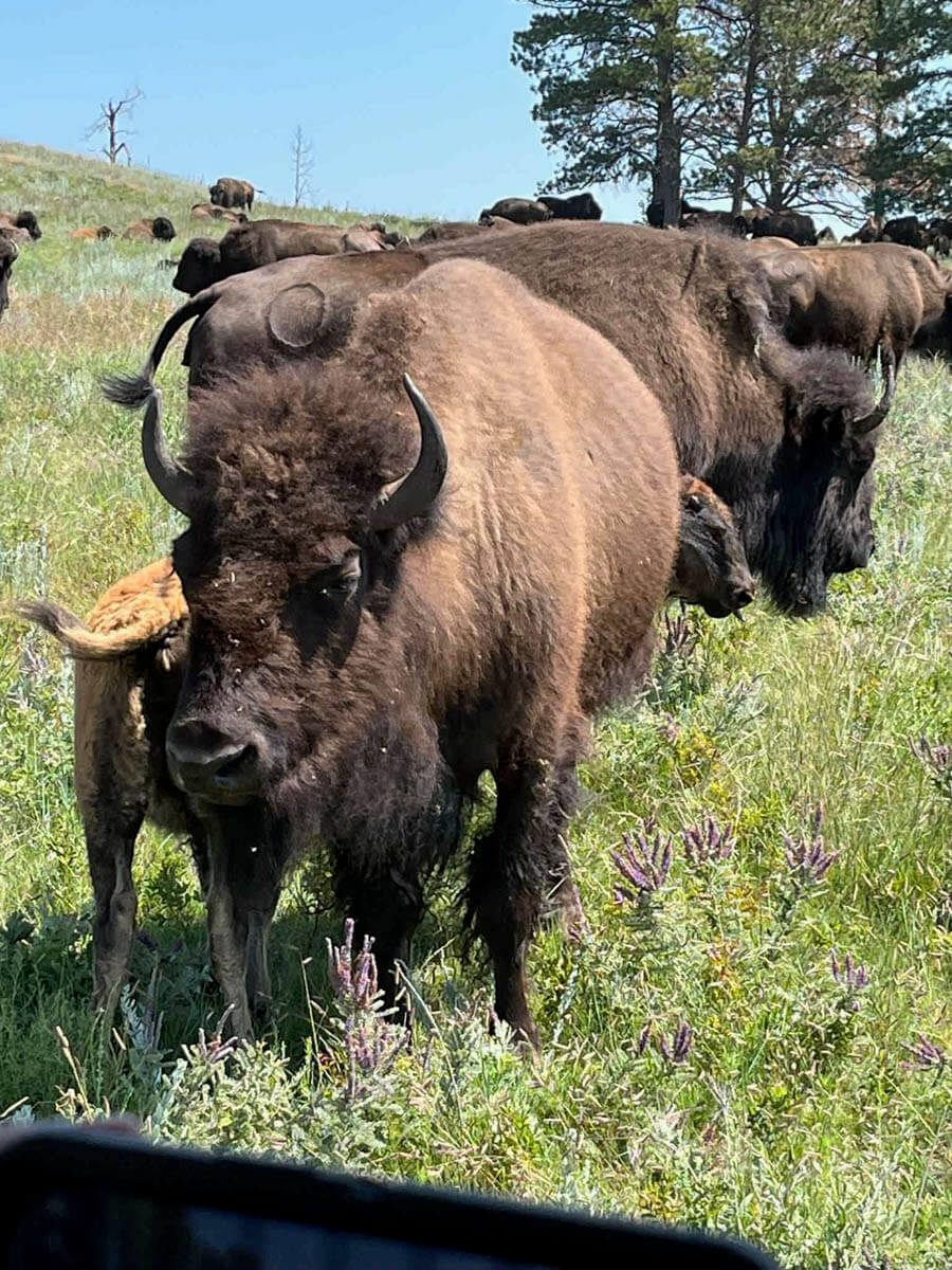 “Barb booked a train ride through the mountains for us. The train took us alongside mountains and through forests, farms, and ranches. The narrator described stories from history that magnified the setting and made it come to life. We went on a buffalo safari in Custer State Park. The tour guide parked our jeep right in the middle of the buffalo herd. Although it was scary at times, it was beautiful to see animals in their own habitat.”